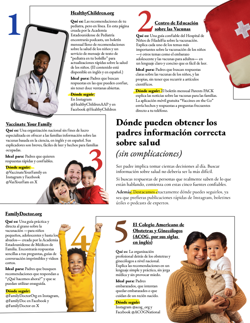A three-part collection of factsheets highlighting where people can find reliable, science-based information on vaccines, general health, and kids’ health, including where to follow these sources for ongoing updates. All factsheets are available in both English and Spanish.