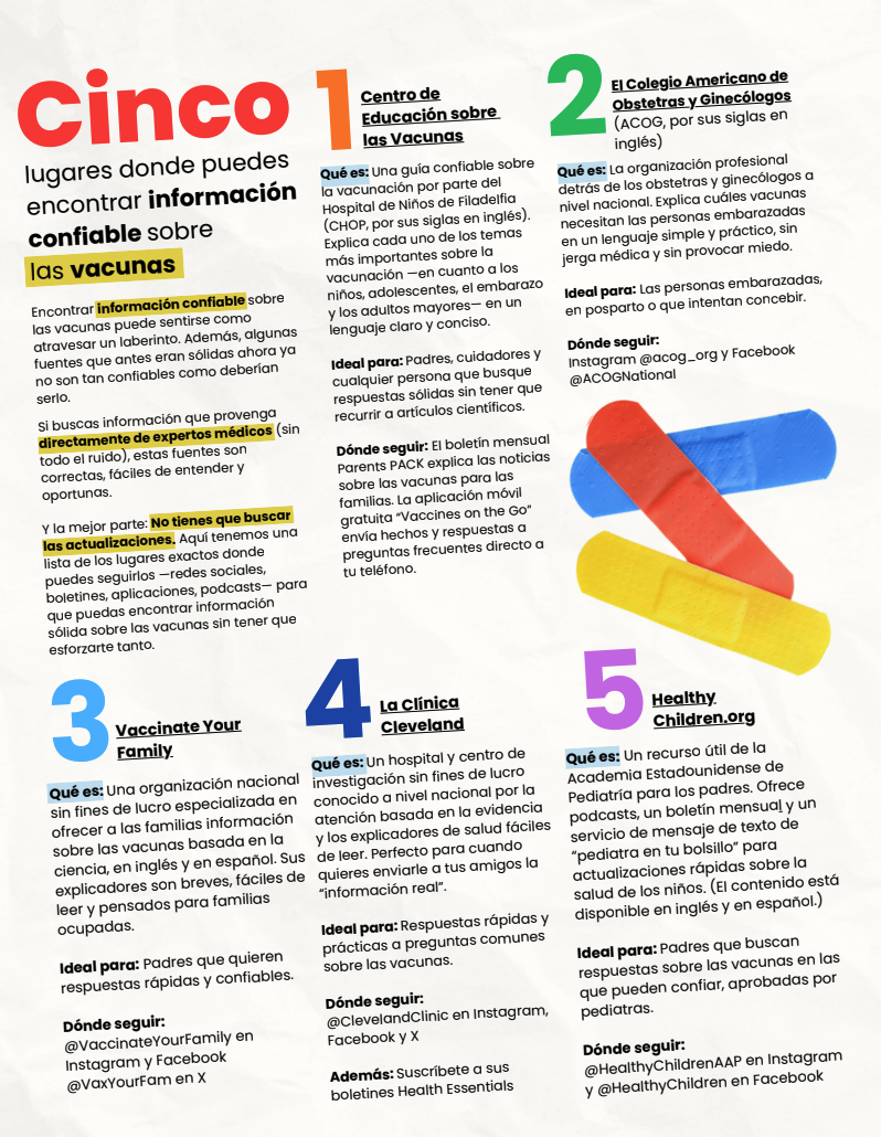 This factsheet highlights five trusted sources for clear, science-based vaccine information: the Vaccine Education Center at CHOP, the American College of Obstetricians and Gynecologists, Vaccinate Your Family, the Cleveland Clinic, and HealthyChildren.org from the American Academy of Pediatrics. Each trusted source includes a blurb about what it is, who it’s made for, and where to follow for up-to-date guidance. Looking to share this information on social media? Here's a carousel version you can post.