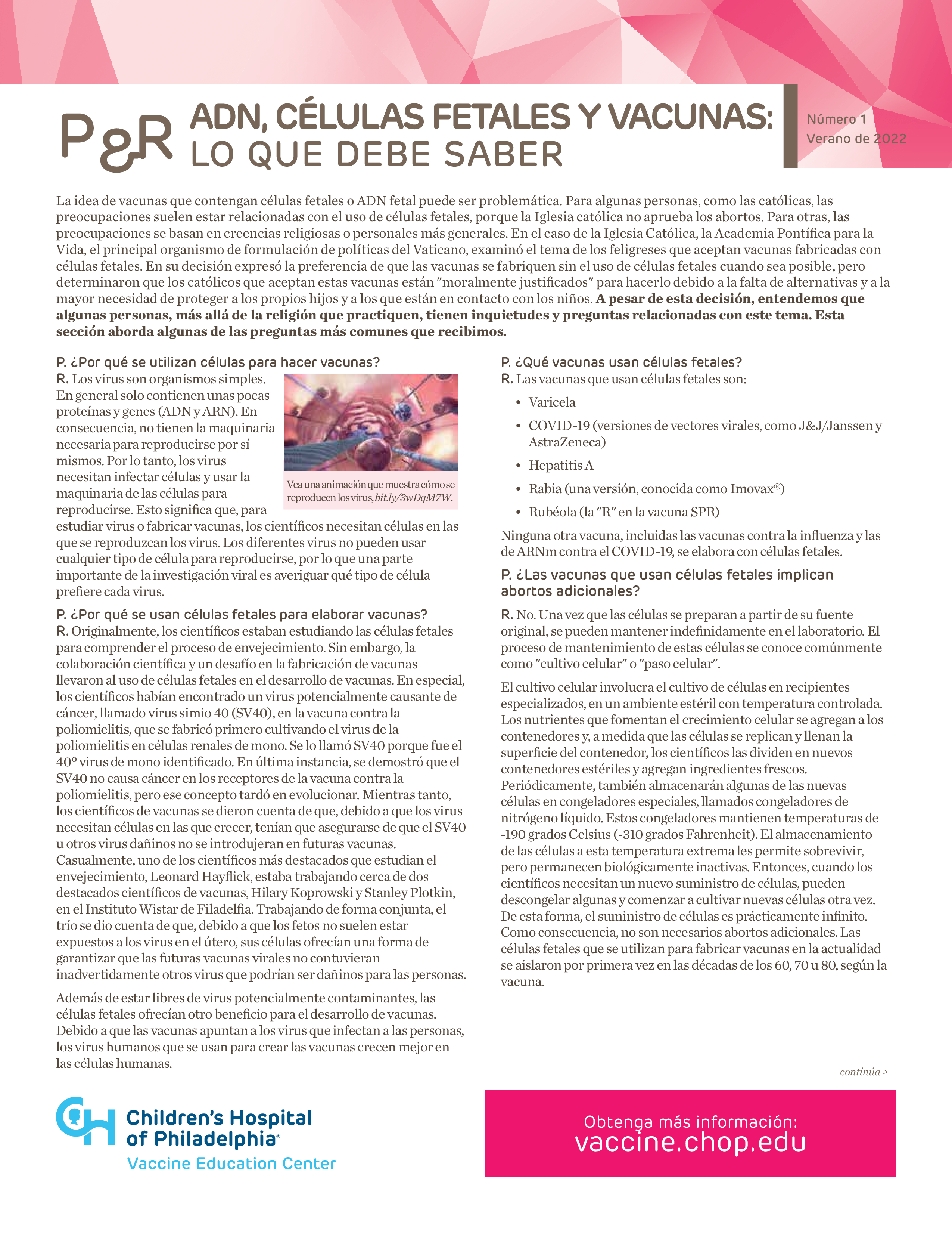 Factsheet address the concerns that many have about vaccines containing fetal cells or fetal DNA. This resource provides answers to some of the most common questions about the use of fetal cells in vaccines.