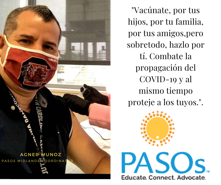 Graphic encourages Latino families to get the COVID-19 vaccine to protect themselves and their loved ones. PASOs helps build a stronger South Carolina by supporting Latino communities with education, advocacy, and leadership development.